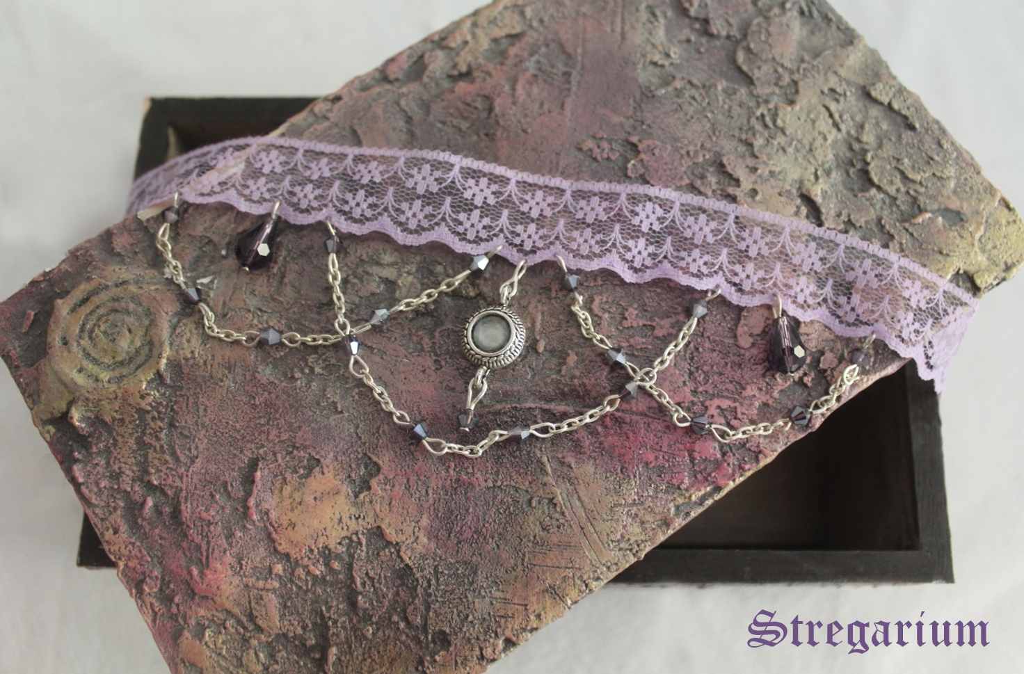 "Austen Valzer", Collarino con pizzo lilla, catena tinta argento e micro cristalli lilla, charm rotondo e perle a goccia viola, chiusura regolabile. Lunghezza totale collarino compresa catena di chiusura: 40 cm